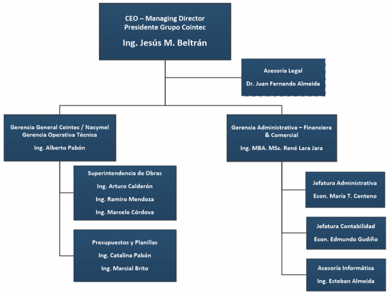 El Grupo Cointec-Nacymel hoy cuenta con más de 1,200 trabajadores, liderados por un calificado grupo de 22 ingenieros y supervisores con amplia experiencia en obras civiles y montajes electromecánicos. El grupo administrativo de la empresa consiste de 29 profesionales que incluye economistas, contadores, abogados y personal de ventas, recursos humanos, seguridad industrial y medio ambiente.